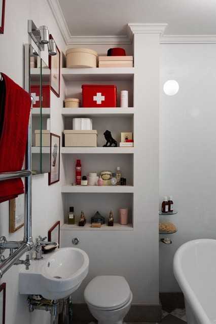 Если у вас очень маленькая ванная, используйте стены. В этой крохотной ванной предостаточно места для хранения всего необходимого благодаря встроенным полкам (которые также скрывают непривлекательные трубы).