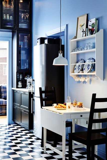 В этой кухне с мебелью от IKEA решено множество проблем, связанных с размещением необходимых вещей — с помощью вместительных шкафчиков, встроенных в стену вокруг дверной рамы. Вещи, которые используются редко, размещены вверху, а прямо над столешницей расположены маленькие полки для размещения небольшой утвари, используемой ежедневно. Аккуратные контейнеры для хранения кухонных принадлежностей стоят на холодильнике, а на настенной полке выставлены декоративные тарелки и чашки.