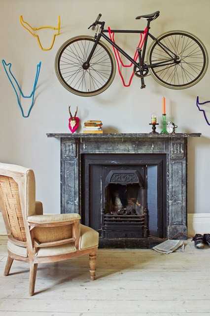 Вы можете не просто убрать громоздкий велосипед с дороги, но и превратить его в стильный элемент декора с помощью вот такого настенного держателя для велосипедов. Не обязательно вешать его на стену над камином — коридор или стена в прихожей тоже отлично подойдут для этой цели.