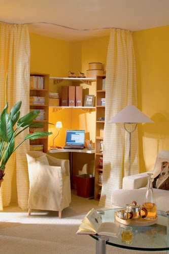 а тут рабочее место в углу комнаты, закрывающееся шторками.