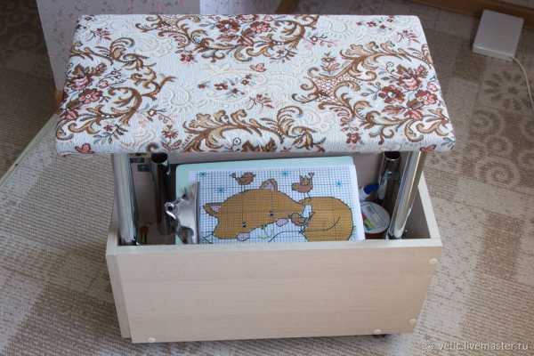 Маленький ящичек на колёсиках с мягкой, обитой гобеленом крышкой готов открыть вам свой большой секрет. Всё дело в том, что этот ящик предназначен для выполнения сразу нескольких функций! Давайте легонько потянем его за крышку. Крышка вынимается, и перед нами предстаёт сам ящик и непонятное, похожее на прямоугольный пуфик «нечто» на металлических ножках.