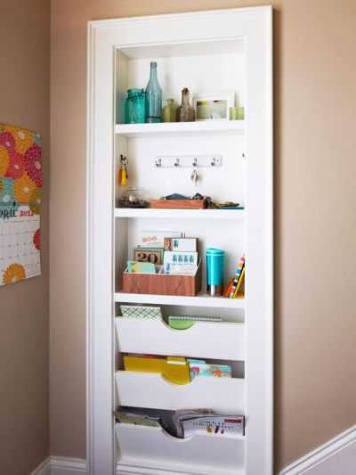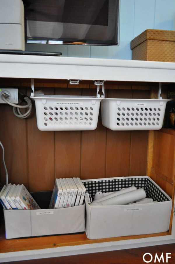 Можно сделать полочки, приобрести один или несколько органайзеров или небольшие корзинки, подходящие по размеру.