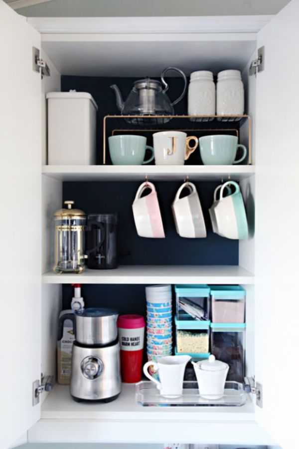 Используйте подставки для полок, чтобы сэкономить место даже в маленьком шкафу.