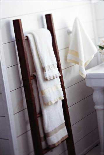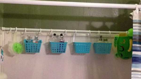 23. Вдоль стены над ванной разместить еще одну штангу на распорках, на нее навесить корзинки для хранения всяких банных принадлежностей. Это позволит не сверлить стены под полочки.