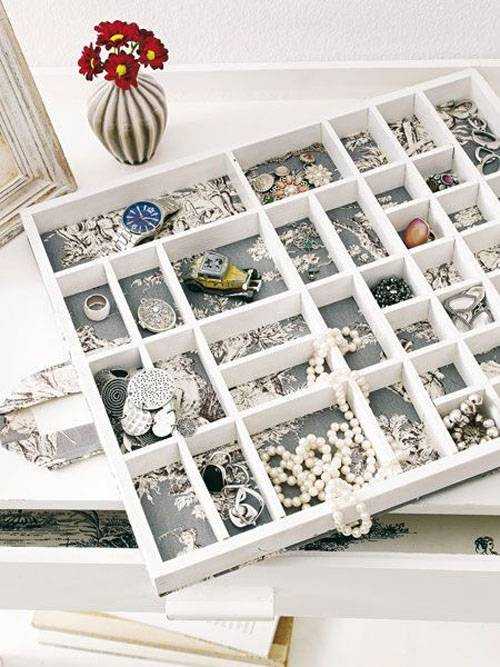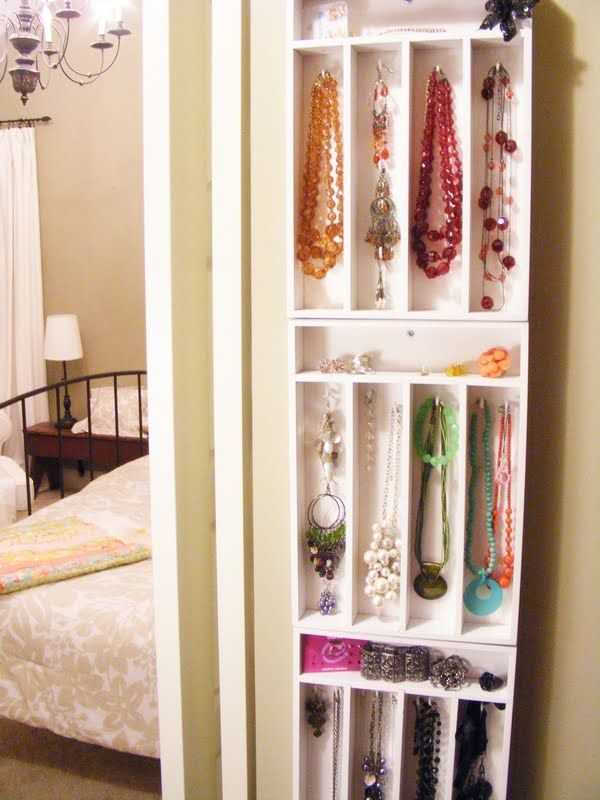 С помощью лотков для столовых приборов также можно организовать свои украшения. Причем, их можно повесить на боковую стену шкафа.