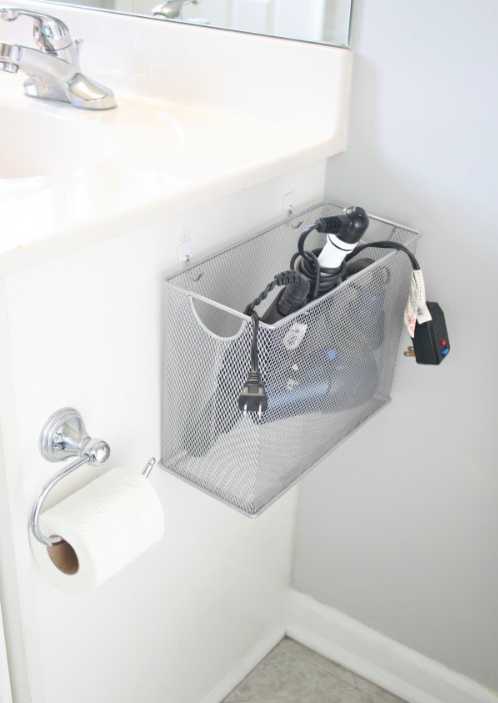 Такая идея подойдет для ванной комнаты, желательно выбрать корзины разных размеров3. Держатель для журналов и бумаг может стать карманом для фена и других электроприборов