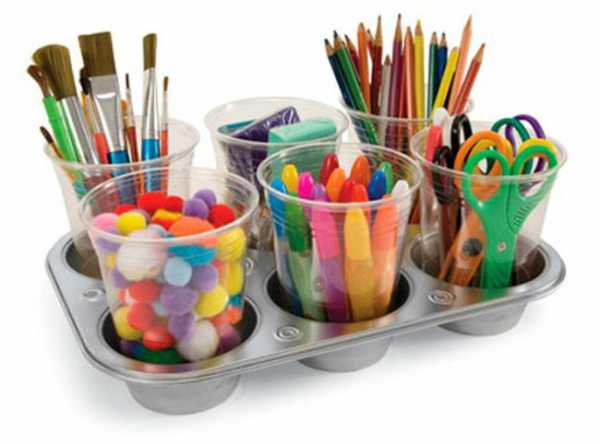 Также в мыльнице можно хранить наклейки, мелки, карандаши12. Поставьте пластиковые стаканчики в формочку для выпекания