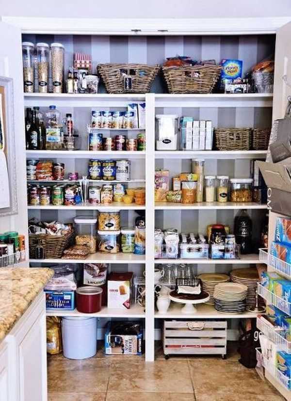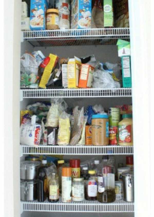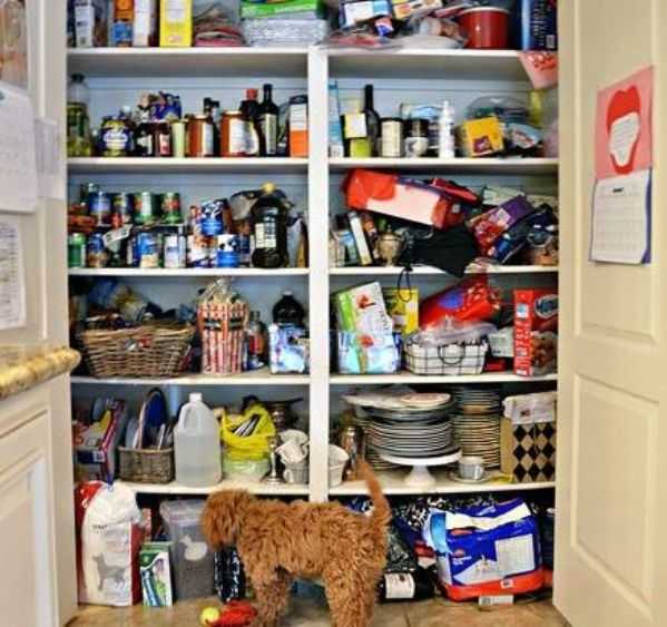 В такой кладовой трудно найти нужные продукты или емкости. Полки просто беспорядочно завалены всем, чем попало.