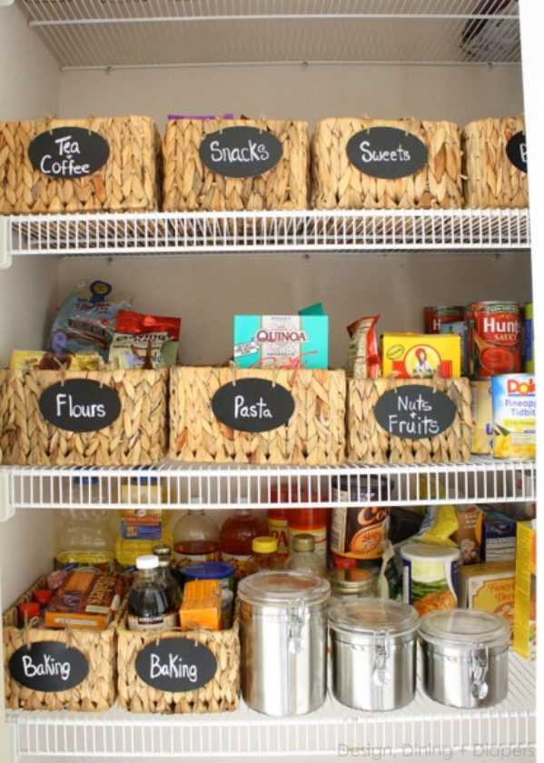 Появились корзинки я ярлычками. Причем используются ярлычки, покрытые графитовой краской, на которой можно писать мелом, что очень удобно, если содержание корзинок будет меняться. Краску можно купить в специализированных магазинах или канцтоварах. Для ярлыков можно использовать картон.