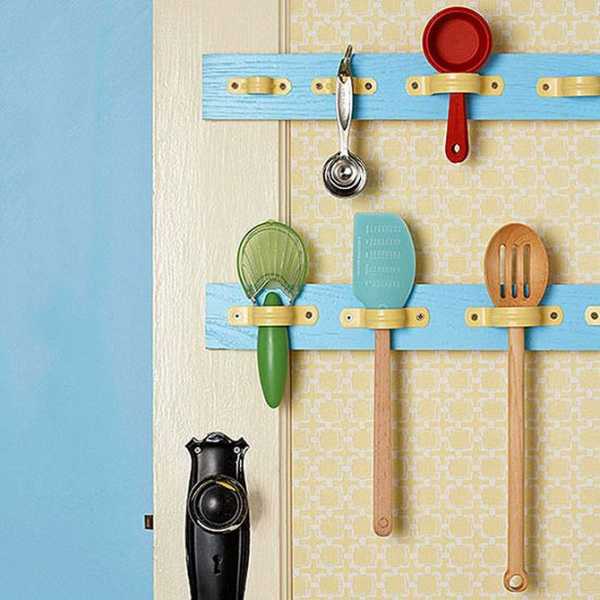 С помощью хомутов для подвешивания труб (есть в любом строительном) можно организовать порядок среди кухонных приспособлений.