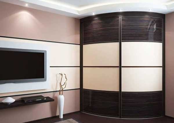 Диагонально-угловой или радиальный шкаф имеет немного выпуклый фасад. Такие «купе» сложнее и дороже линейных моделей, поскольку сложно подогнать кривизну выпуклой дверцы под круглую направляющую. Зато эти конструкции имеют максимальный внутренний объем и красивый фасад. Чаще всего это дизайнерские шкафы-купе.