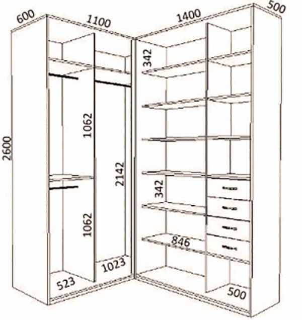 Совет. Выбирайте вариант, когда вглубь угла уходит штанга платяного шкафа с тремпелями (плечиками на крючках), чтобы было удобно перемещать одежду.