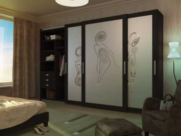 Декоративные стекла – перечисленные выше разновидности. Шершавый пескоструйный рисунок или матовое стекло можно комбинировать с раздвижными зеркалами. Такой дизайн дверей шкафа-купе подходит для классического и современного интерьера.
