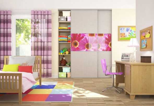 В детском шкафу купе должно быть предусмотрено место для одежды и, конечно же, игрушек и самых разнообразных детских принадлежностей. Дверь может быть как одна, так и несколько, в зависимости от размера модели. Рисунок можно выбирать детский из мультика или сдержанный классический, все зависит от желаний ребенка и его родителей.