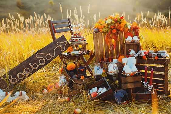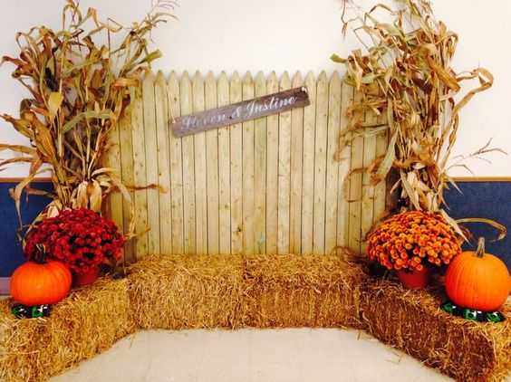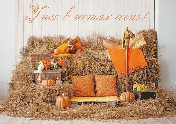 Что как не скошенное поле напоминает об осени. Главный цвет здесь темно бежевый, цвет высохшей травы. Поэтому при организации стенда или локации лучше всего ориентироваться на схожие оттенки. Обязательно должны быть яркие акценты: шарики, тыквы, овощи и фрукты. Если их не использовать, то фото будет скучным и невзрачным.