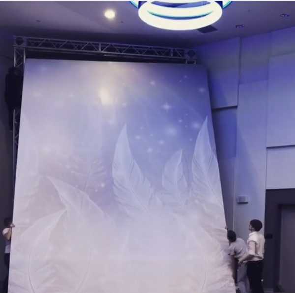 - Закрепить белую и голубую органзу в виде театральных кулис.