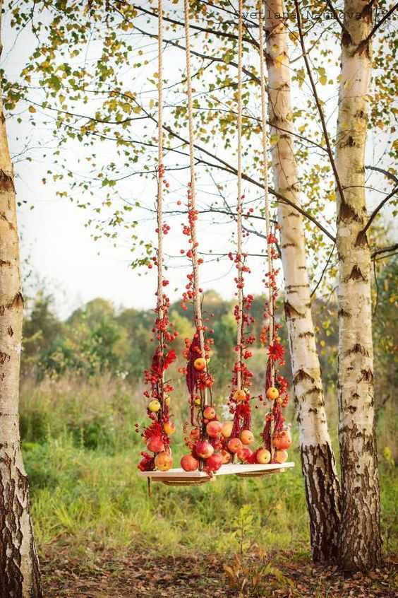 - В саду навесить качели, красиво красиво украсить их гирляндами цветов.