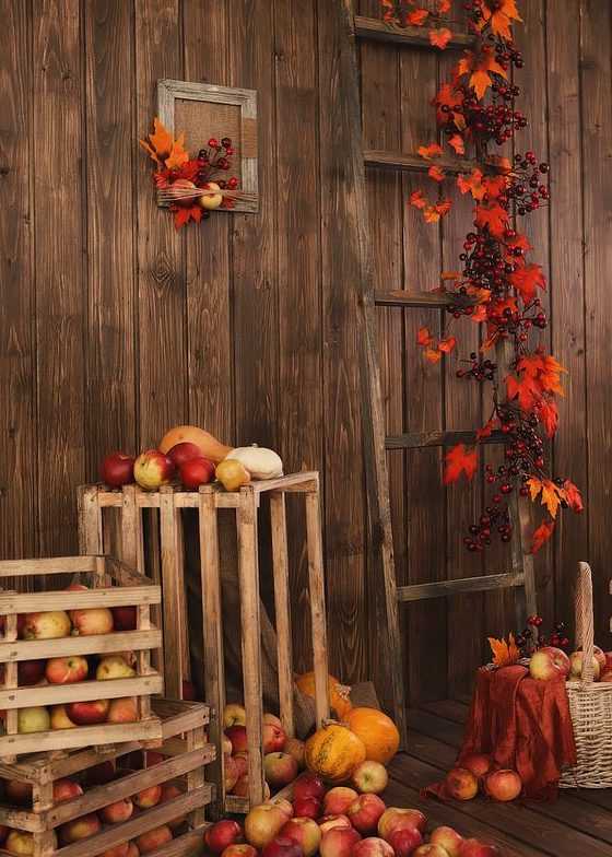 Большая удача найти в поле стога сена, тогда они станут вашим фоном. Чудесную деревенскую композицию разбавят белые платочки, скатерти или полотенечка, на которых можно разложить яблоки. Для удобства можно поставить табуретку или лавочку в деревенском стиле.