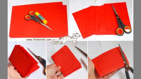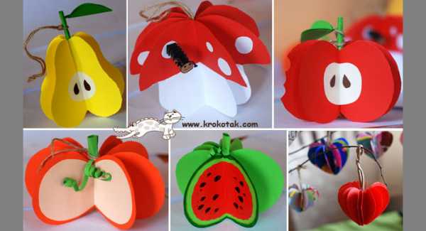 Затем можно выполнить поделку посложнее. Складываем листы цветной бумаги стопкой, затем «книжечкой». Карандашом наносим очертания будущего фрукта или овоща: яблоко, груша, тыква, арбуз, гриб и т.д.