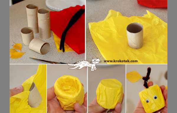 Из ролика от туалетной бумаги и листка цветной бумаги можно сделать яблочко или даже целую яблоньку. Для этого оборачиваем ролик цветной бумагой и крепим к нему декоративные части. Для яблочка используем половину ролика и крепим черенок, листик, по желанию — мордочку. Для дерева крепим крону, обклеенную листьями из кусочков цветной бумаги. Для основы кроны можно использовать картон или одноразовую тарелку.