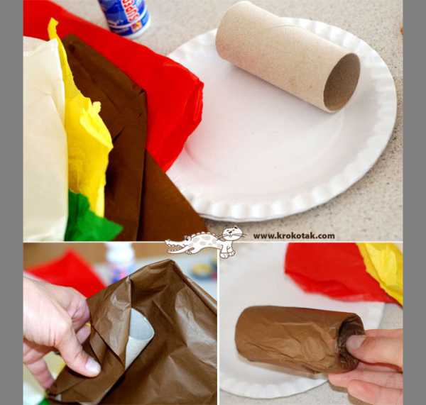 Шаг 1. Из набора цветной бумаги достаньте листы красного, оранжевого и желтого оттенков. Нарвите бумагу на мелкие кусочки. Этот этап особенно нравится детям, к тому же развивает их мелкую моторику. Бумага нужна будет для аппликации, но нарезать ее не стоит. Рваные края кусочков будут смотреться в данном варианте поделки уместно и интересно.
