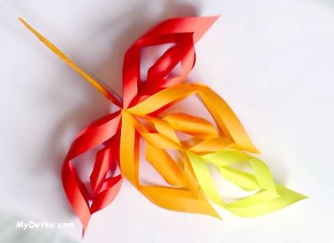 Оригинальный лист-гармошку выполнить еще быстрее, чем лист в технике оригами. Для его изготовления нужно сделать посередине листа цветной бумаги загиб. Сложить лист «гармошкой». По центру сделать своеобразное углубление, прикрепить к нему «черенок» листика из цветной бумаги или ниток, и затем соединить две получившиеся части листа, склеить их для прочности.