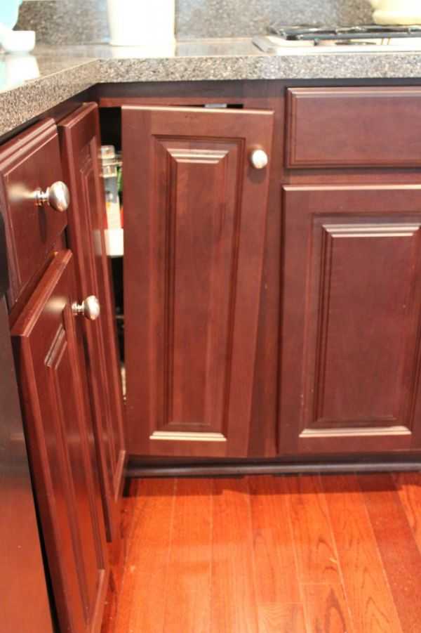 Наиболее критичен этот факт при разработке дизайн-проекта угловой кухни. По моему опыту, именно от углового модуля «отрезают» сантиметры, причем десятки. А это значит, что полноценного открывания у той же угловой мойки не будет. Что можно сделать внутри тумбы, если дверца в нее будет шириной всего 250-300 мм?