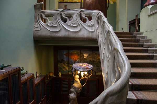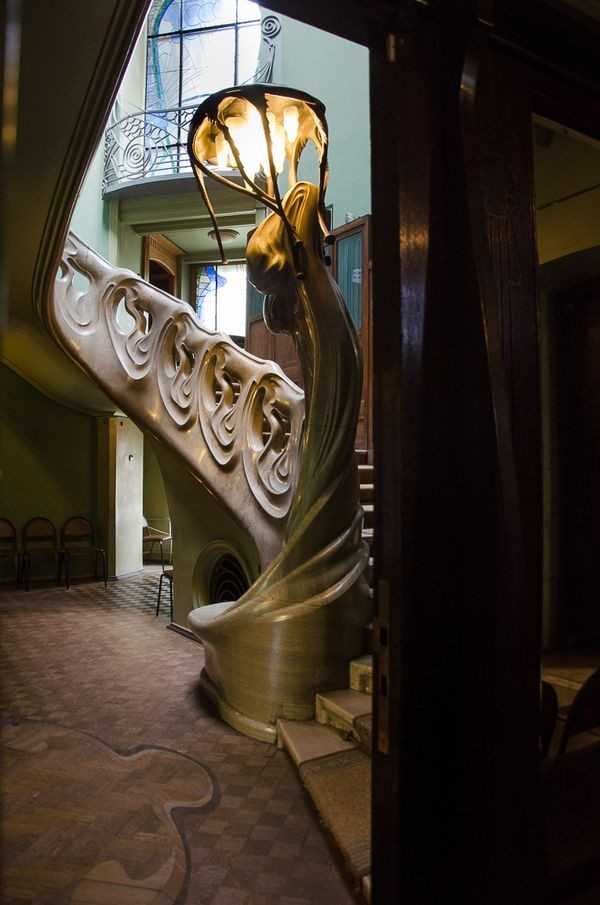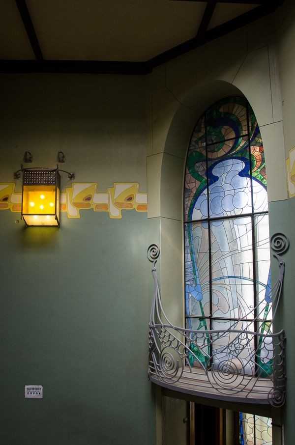 Небезынтересный балкончик над лестницей похож на дракона или сову. Брови этого зверя образуют собой МХАТовскую чайку – символ, нарисованный Шехтелем для А.П.Чехова. Театральность, мистицизм и желание увести от реальности характерны для стиля модерн, и Шехтелю удалось блестяще воплотить эти черты в архитектуре. Балкон, кстати, функциональный. Вот это стремление дезориентировать посетителя, увести от реальности, чтобы дом не раскрывался, чтобы чувствовалась некая тайна — особенность стиля модерн. Архитектурное пространство модерна — философское пространство. Мистика дома — впервые в архитектуре.