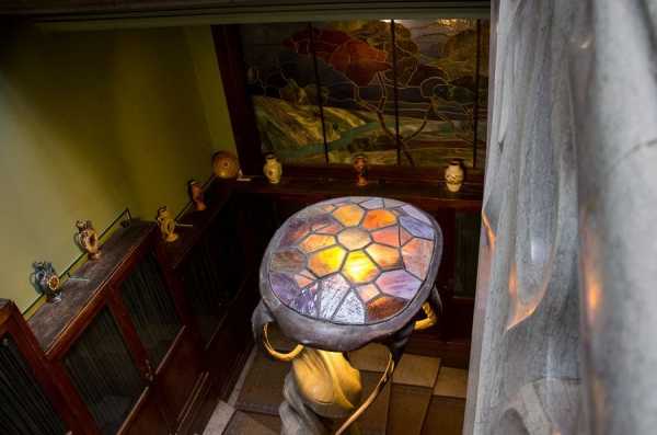 Но самое мистическое в этом доме — это витражная картина, которая в зависимости от освещения и точки обозрения постоянно меняется — может быть то холодной синей, то ярко-желтой. Интерьер постоянно преображается за счет света и цвета витражей. Как и в природе — нет ничего постоянного. Украшающий эту прихожую витражный пейзаж очень важен для общей стилевой и философской концепции дома. Модерн, как известно, черпает вдохновение в природе и активно заимствует ее образы. Небезызвестно и то, что красавица-природа непостоянна и изменчива. В течение всего дня этот витраж меняет свой вид, изображая то вечерний, то дневной, то утренний, то ночной пейзаж в зависимости от освещения и угла зрения. Андрей Вознесенский любил витражи и часто приходил сюда. Он говорил: «Магия преломленного света может быть адекватна поэзии слова».