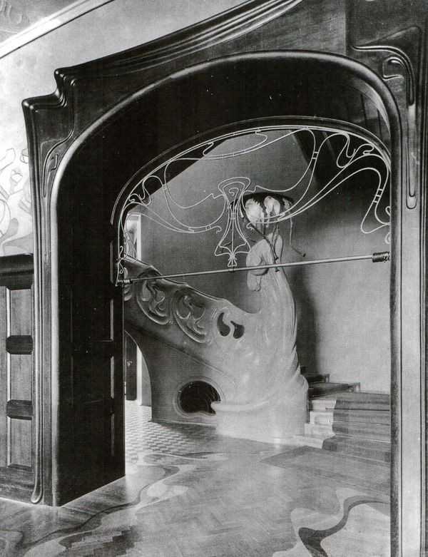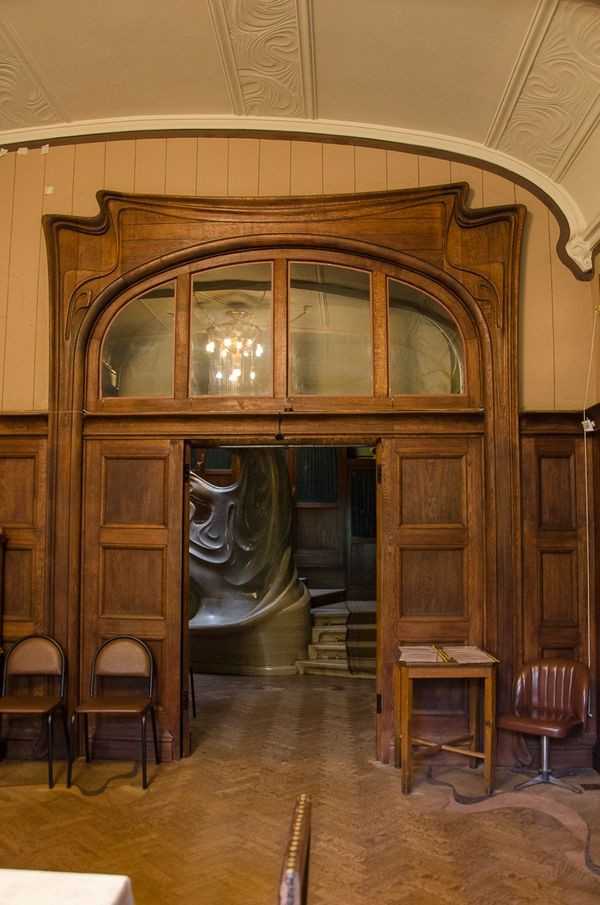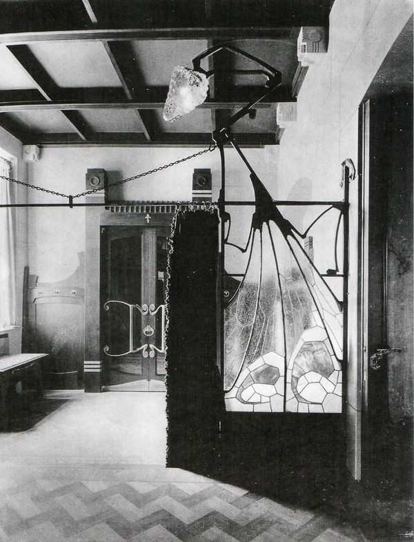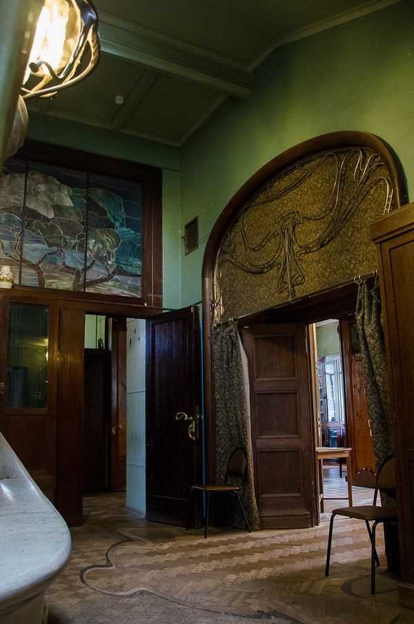 Вестибюль парадного входа. Пол в парадной прихожей напоминает водную гладь, в которую брошен камень. Мозаика-египетский знак воды. Каждая деталь обусловлена общим смыслом дома. Дверная ручка — морской конек. Еще одна модель дверной ручки — остроумная и гениальная одновременно. Дело в том, что на тот момент еще не было изобретено небьющееся стекло, и эта ручка прекрасно его защищает. Стекло 1902 года до сих пор не разбивалось и не менялось. Вместо гигантских шкафов стояли витражные ширмы, напоминающие крылья стрекозы. Это было сказочное, необычное пространство, похожее на театральные декорации.