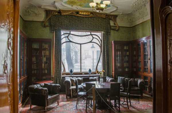 Свет, проходя через витражный абажур и голубовато-синий витраж окна, усиливают ощущение фантастического мира, созданного Шехтелем. Уникальна каждая деталь интерьера: ручки дверей; паркет, выложенный под рыбью чешую или с волнообразной каймой; колонна с лилиями и саламандрами в капители или колонна, основание которой обвито клубками змей; обои с наскальными рисунками – все создает чувство единения с миром природы.