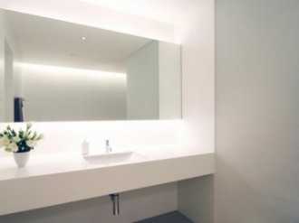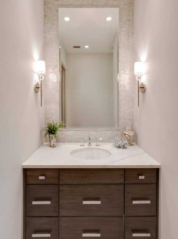 - Освещение над зеркалом следует делать ярким, но рассеянным и мягким.