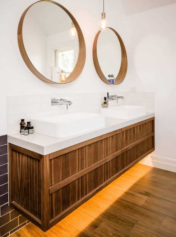 - Установленные в ванной комнате шкафчики лучше всего освещать встроенными светильниками небольшого размера.