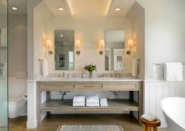 Каждое ваше утро начинается именно в этом помещении, поэтому оно должно вас радовать и эстетикой общего декора, и гармоничным освещением. Пускай с утра это будет яркий свет, а вечером, расслабляясь в ванне, вы можете оставить только настенный фонарь над зеркалом или пару точек под потолком.