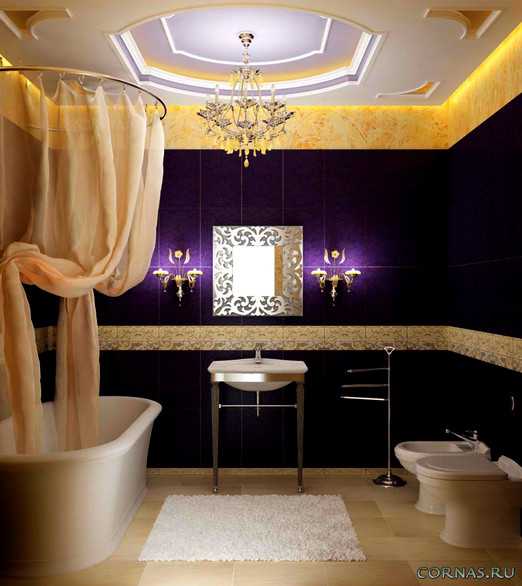 - В большой ванной комнате, отремонтированной в классическом стиле, провансе, ампире, барокко, рококо уместно использование люстр с позолотой и хрусталем.
