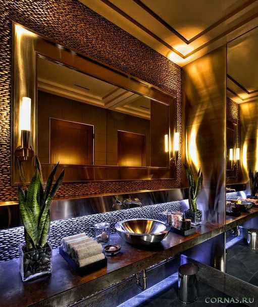 При наличии большого зеркала светильники могут крепиться прямо к стеклу, и свет будет приумножаться за счет отражения. Если два зеркала: над раковиной и над ванной, то, что над раковиной, должно освещаться открытым прямым светом с широким углом рассеивания, а то, что над ванной – скрытым светом, пущенным за выступом потолка или со специального карниза, ниши. Можно сделать декоративную стеклянную или зеркальную стенку прямо за ванной, «разбросав» светодиодные светильники по ее поверхности.