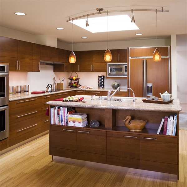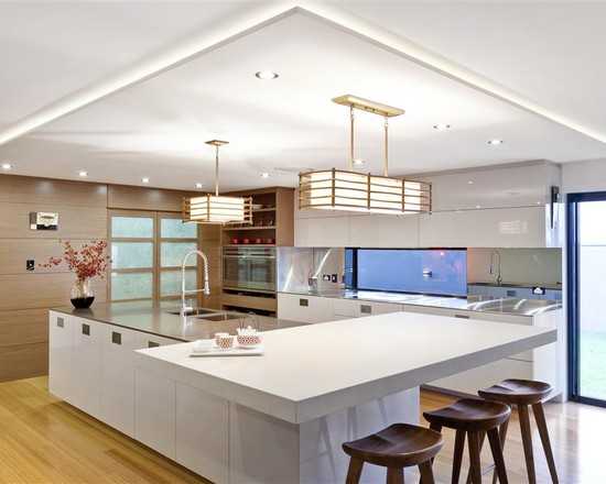 В кухнях современного типа имеется достаточно места для создания уютной атмосферы с подходящим источником света. Широкие площади требуют внимательного подхода к освещению, которое можно устанавливать как на потолках, так и на стенах.