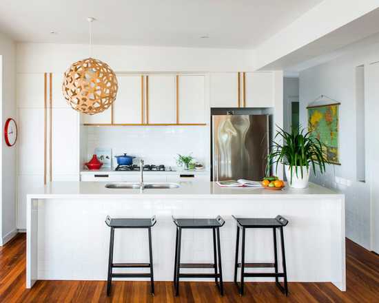 2. Подвесные светильники над барной стойкой – деликатно зонируют пространство. При выключенном кухонном свете они создадут более интимное пространство гостиной – ничего не будет отвлекать вас от отдыха.