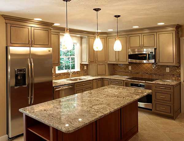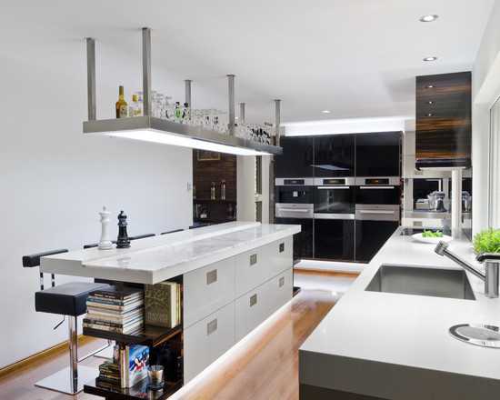 Для таких кухонь подойдет установка подвесных светильников, ярко освещающих все необходимые участки. Можно также использовать в качестве освещения линейные светодиодные лампы.