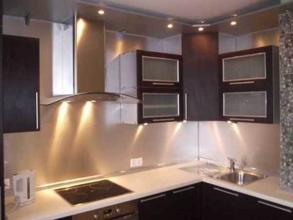 Широко используемым источником освещения для равномерного освещения всей площади кухни является специализированная конструкция с точечными светодиодами. Конструкция представляет собой подсветку в вечернее время над определенными участками кухонной площади.