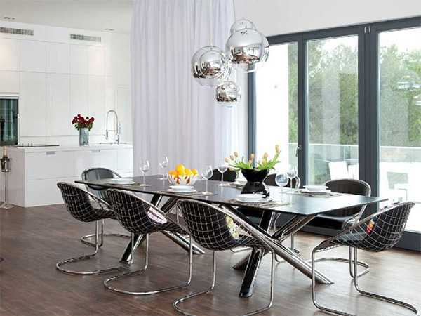 3. Обязательная вещь – красивая люстра над обеденным столом. Она создаст нужное настроение: торжественную обстановку при приеме гостей или романтичную – для ужина для двоих. Обратите внимание на светильники, высоту которых можно менять одним движением руки – это удобно.