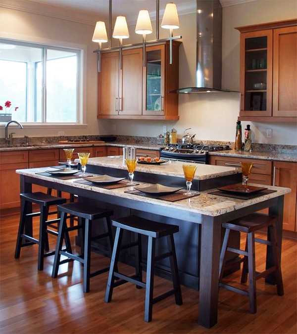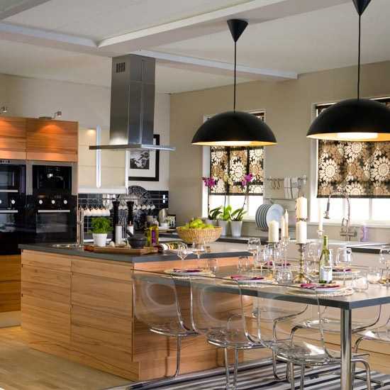 Для экономии электричества лучше использовать осветительные приборы, которые при необходимости можно подключать отдельно, чтобы осветить необходимый рабочий участок (например, обеденный стол или барную стойку).