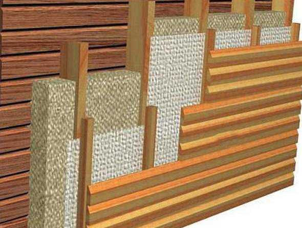 После того как первая обрешетка готова, необходимо утеплить стены. Утепление производится с применением минваты или минматов. Утеплитель плотно крепится во все свободные от брусков ячейки. Если обрешетка достаточно далеко выступает от поверхности можно утеплитель положить в несколько слоев.