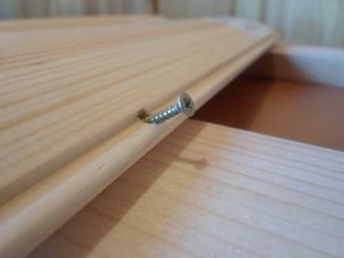 - После проделанной работы приступаем к монтажу следующей панели. В верхнюю часть предыдущей доски прямо в шип, вворачиваем саморез, причём так, чтобы его шляпка оказалась вровень с самим шипом ( с его поверхностью).