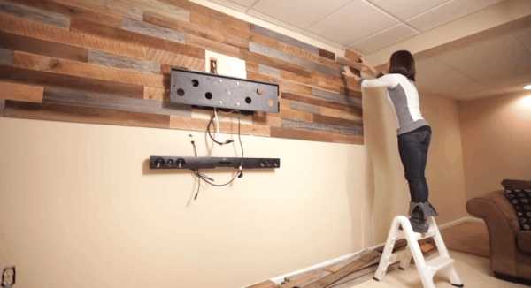 Теперь начинаем нарезать доски под нужные нам размеры и сажать их на шурупы, начиная от пола. Лучше прикладывайте каждую доску к стене, замеряйте и только потом режьте: даже самые ровные стены оказываются неидеальными, так что лучше перестраховаться. Чередуйте доски разных оттенков, периодически отходите, чтобы оценить чуть издалека, что получается.