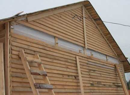 Обшивка может крепиться непосредственно к бревнам гвоздями длиной 80 – 100 мм. Для утепления делается обрешетка из деревянного бруса. Между вертикальными стойками укладывается утеплитель, закрывается гидроизоляцией. К выступающему выше минваты брусу монтируется отделка из доски.