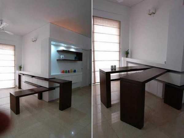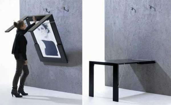 Стол можно замаскировать под шкаф, полку или тумбу. Конструкции экономят пространство и делают дизайн помещения современным и функциональным.