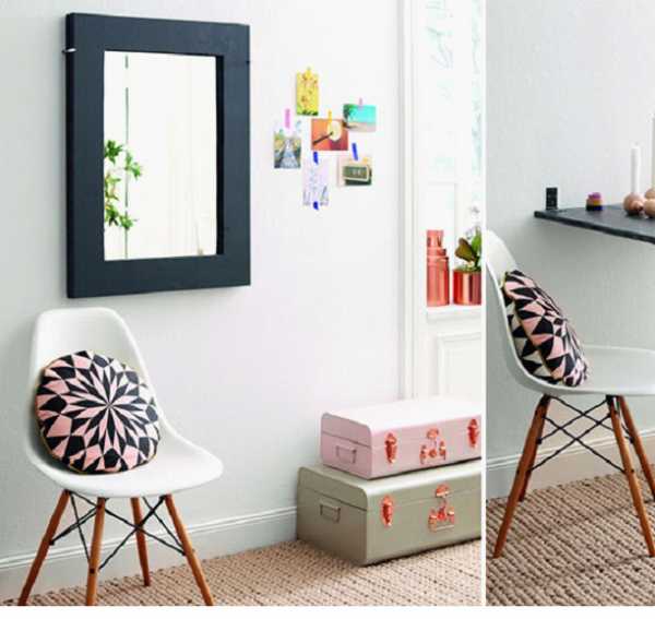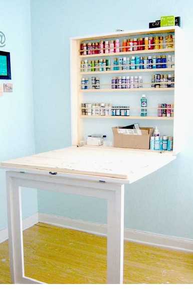 Варианты откидных столов в магазинах предполагают разную форму и цвет. Они не требуют украшения, так как постоянно складываются-разбираются. Если вы хотите обустроить творческое пространство вокруг, используйте настенные украшения: картины, постеры.