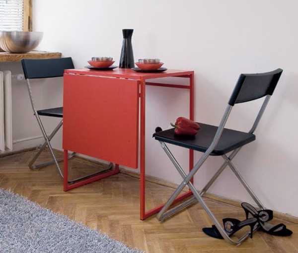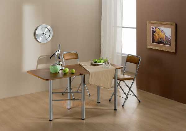 Такой маленький обеденный стол в сложенном состоянии вполне поместится в кухню и даже может нести на себе что-нибудь вроде чайника, вазы с хлебом или фруктами – то есть какие-нибудь легко перемещаемые вещи. Правда, столы типа «книжка» не очень удобны для использования в сложенном состоянии, так как ноги сидящего человека упираются в свисающую часть столешницы.