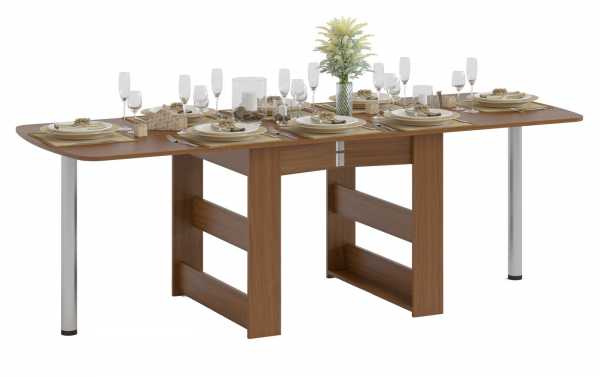 Критериев выбора откидного стола множество, но мы остановимся на самых главных, от которых напрямую зависит удобство эксплуатации мебели. Первый принципиальный фактор – габариты модели в разложенном виде. Учитывайте размеры столешницы относительно не только площади помещения, но и количества человек, которые будут за ней одновременно размещаться.